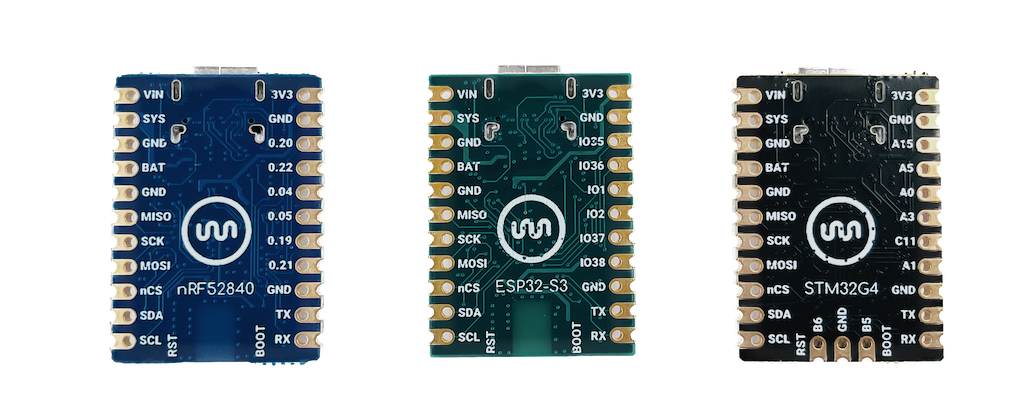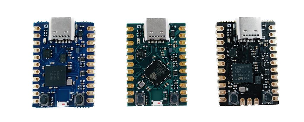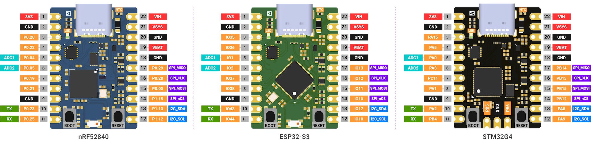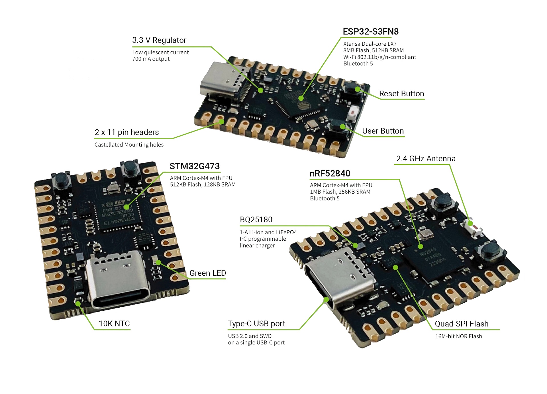 모두 동일한 폼팩터로 서로 호환돼요. 2 x 11 핀 헤더를 통해 다른 보드에 모듈처럼 탈착할 수 있어요디버거용 USB-C 포트